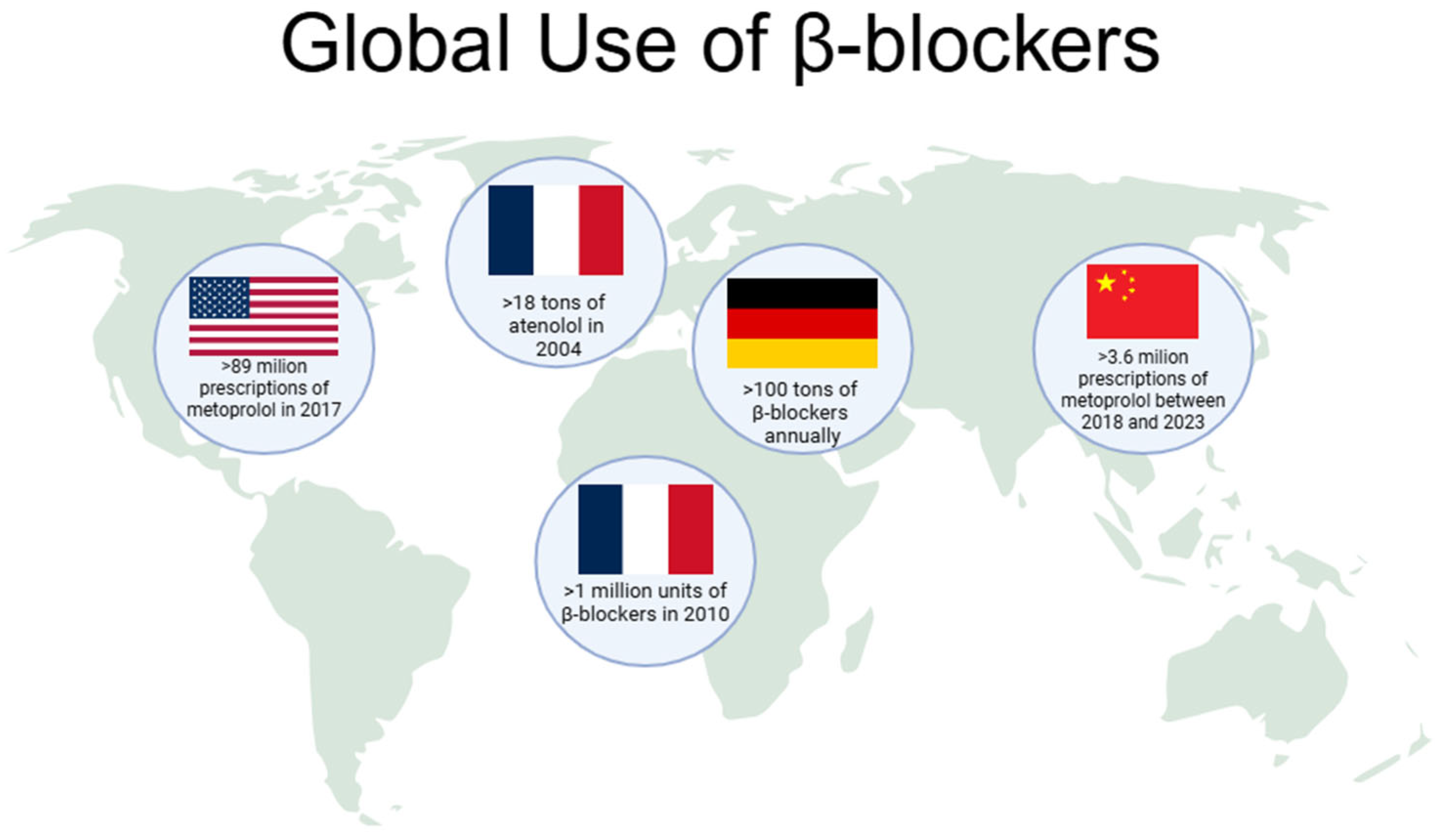 β-blockers represent one of the most extensively prescribed classes of cardiovascular drugs worldwide (Figure 1). In France, consumption levels exceeded 18 tons of atenolol in 2004, while in Germany, the annual use of β-blockers has been estimated at approximately 100 tons per year. In the United States, β-blockers consistently rank among the top 100 most prescribed medications, with metoprolol alone accounting for more than 89 million prescriptions in 2017, making it the fourth most commonly dispensed drug nationally. Similarly, rapid growth has been observed in Asian markets: in China, metoprolol use has risen sharply, its annual consumption nearly doubling from about 27.9 kg in 2011 to 63.8 kg in 2015, in line with the increasing burden of hypertension. This upward trend continued, with over 3.6 million prescriptions issued between 2018 and 2023. In the United Arab Emirates, national pharmaceutical data indicate that β-blocker consumption surpassed one million units in 2010, further highlighting their expanding role in managing cardiovascular disease in the Middle East. Collectively, these statistics reflect the global dependence on β-blockers and the growing burden of cardiovascular disease that continues to drive their demand [5,6]. However, β-blockers’ global usage reflects wide economic disparity. In the year 2021–2022, the lowest absolute 30-day β-blocker prices were reported in Bangladesh and Pakistan, while the highest price ratios were in high-income North America and the U.S. Despite low absolute costs in some low- and middle-income countries, β-blocker-inclusive regimens were least affordable in low-income regions like Uganda due to catastrophic gross national income burden and reliance on unreliable public supply, limiting equitable β-blocker uptake [7].