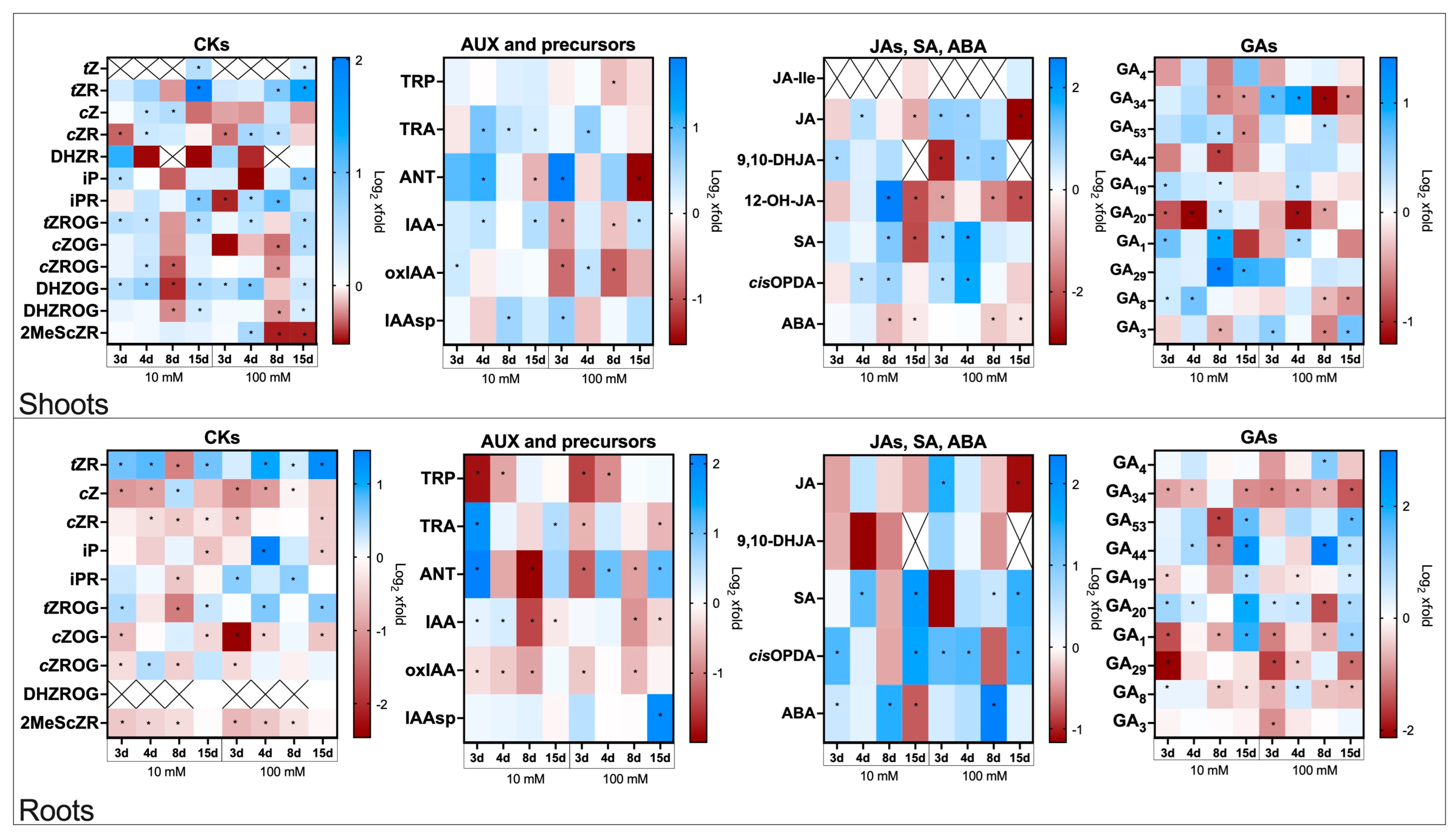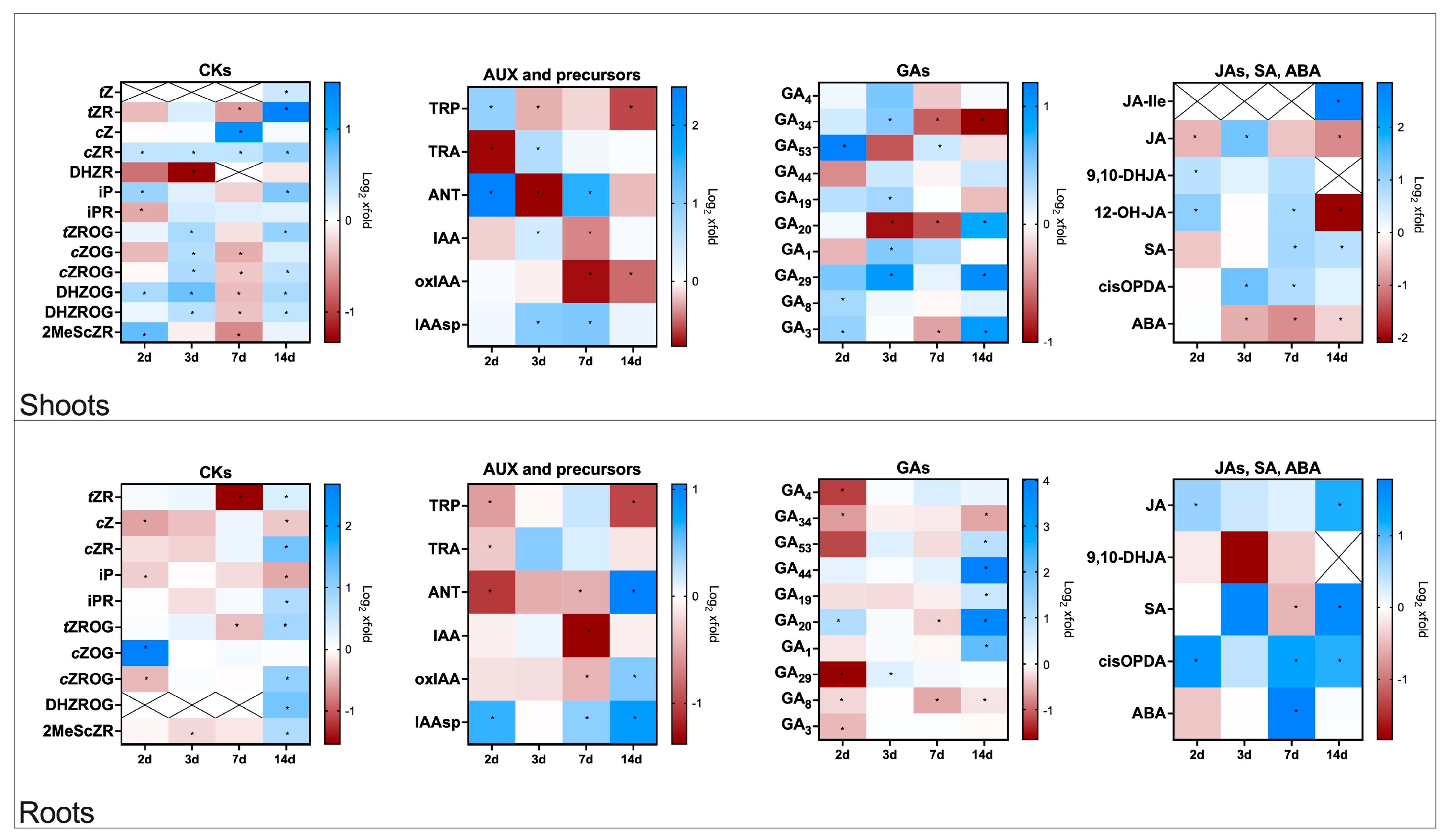 - Šimura, J.; Antoniadi, I.; Široká, J.; Tarkowská, D.; Strnad, M.; Ljung, K.; Novák, O. Plant Hormonomics: Multiple Phytohormone Profiling by Targeted Metabolomics. Plant Physiol. 2018, 177, 476–489. [Google Scholar] [CrossRef]