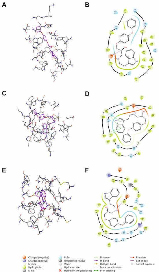 Docking poses of SERAAK2 within the orthosteric binding sites of the 5-HT1A (A,B), 5-HT2A (C,D), and 5-HT7 receptors (E,F). Panels (A,C,E) show the 3D arrangement of SERAAK2 in the receptor binding pocket. The ligand is displayed as sticks with magenta carbon atoms, and receptor residues are shown as sticks with gray carbon atoms. Non-polar hydrogens are omitted for clarity. Key ligand–receptor interactions are indicated by dashed lines (hydrogen bonds—yellow; salt bridges—magenta; π–π stacking—blue). Panels (B,D,F) present the corresponding 2D interaction maps.