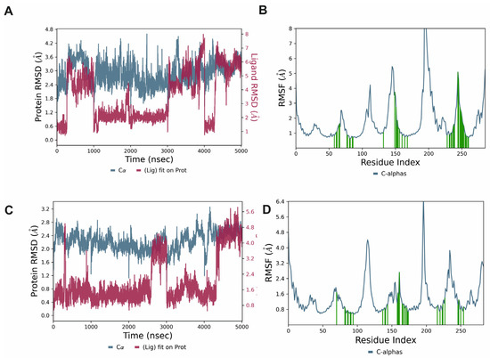 In order to examine the dynamic nature of the protein–ligand complex formation, five SERAAK2 replicas with the 5-HT1A and 5-HT2A receptors were subjected to molecular dynamics simulations with Desmond (Schrödinger, v. 2024.2). Graphical depictions of the ligand and protein root mean square deviation (RMSD) changes are depicted in Figure 3A,C. For the majority of the simulations, SERAAK2 was stable in both receptors.