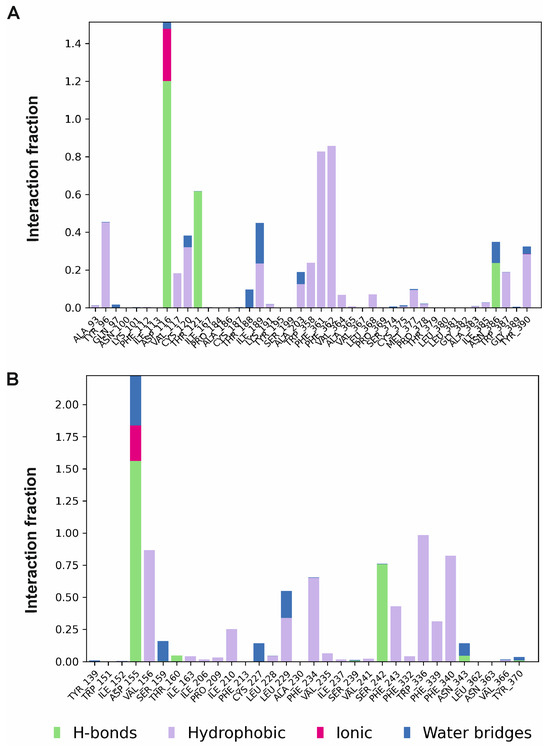 Normalized histograms of ligand–receptor contacts in the simulated complexes of SERAAK2 with the 5-HT1A (A) and 5-HT2A (B) receptors. The stacked bar plots represent contact frequencies averaged over the simulation trajectory. Values reaching 1.0 may occur when individual protein residues form multiple contacts of the same subtype as the ligand.