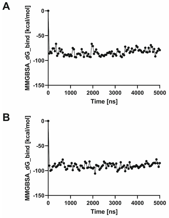 MM-GBSA dG bind over simulation time for SERAAK2-5HT1A (A) and SERAAK2-5-HT2A (B).