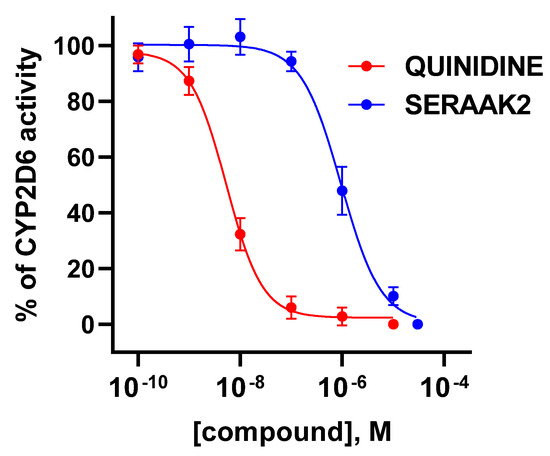 Dose–response profiles for CYP2D6 inhibition by quinidine (reference) and SERAAK2 (test compound).