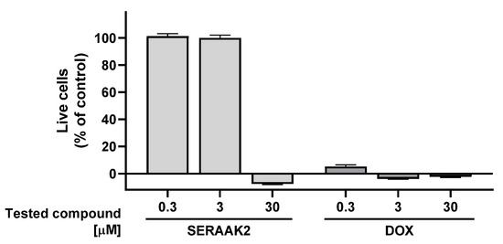 The cytotoxic potential of SERAAK2 was evaluated in two human-derived cell lines chosen for their physiological relevance: HepG2 (hepatocellular carcinoma) and SH-SY5Y (neuroblastoma). Cell viability was quantified using the MTS assay, and the results are presented in Figure 8 and Figure 9. At the highest concentration tested, SERAAK2 demonstrated potent anti-proliferative effects in both models. The compound completely suppressed growth in SH-SY5Y cells (108 ± 1% inhibition) and showed similarly strong cytotoxicity against HepG2 cells (104 ± 1% inhibition), indicating broad cytotoxic activity across different cell types. It is particularly noteworthy that the use of the SERAAK2 compound at a concentration of 30 µM reduces the number of viable cells below the level of the positive control (doxorubicin) at the same concentration (Table 3). Doxorubicin is an anticancer drug that primarily inhibits cell proliferation rather than exerting direct cytotoxic effects. Under the experimental conditions used, after 72 h of incubation, a fraction of doxorubicin-treated cells remains metabolically active and generates a low signal in the MTS assay. The enhanced signal reduction observed in the MTS assay for the tested compound, compared to doxorubicin, indicates strong cytotoxic activity leading to necrosis of the entire cell population.