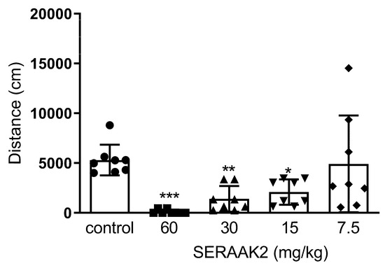 The effects of SERAAK2 (at doses of 60, 30, 15, and 7.5 mg/kg, i.p.) on spontaneous locomotor activity of mice. The tested compound was injected 60 min prior to testing, and activity was recorded over 20 min. Data are expressed as mean ± SEM from a single independent experiment. *** p < 0.001, ** p < 0.01, * p < 0.05 vs. control (Dunnett’s test).