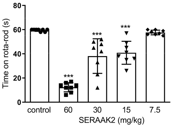 The effects of SERAAK2 (at doses of 60, 30, 15, and 7.5 mg/kg, i.p.) on motor coordination in mice in the rotarod test. The compound was injected 60 min prior to testing. Data are expressed as mean ± SEM from a single independent experiment. *** p < 0.001 vs. control (Dunnett’s test).