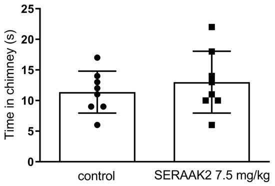 One-way ANOVA revealed significant disturbances in motor coordination of mice after administration of the compound SERAAK2 at doses of 60, 30, and 15 mg/kg in the rotarod test (Figure 11). Mice that received SERAAK2 at a dose of 7.5 mg/kg were held on a rotating rod for about 60 s (Figure 11) and left the chimney in a time similar to that of the control group (about 13 s; Figure 12).