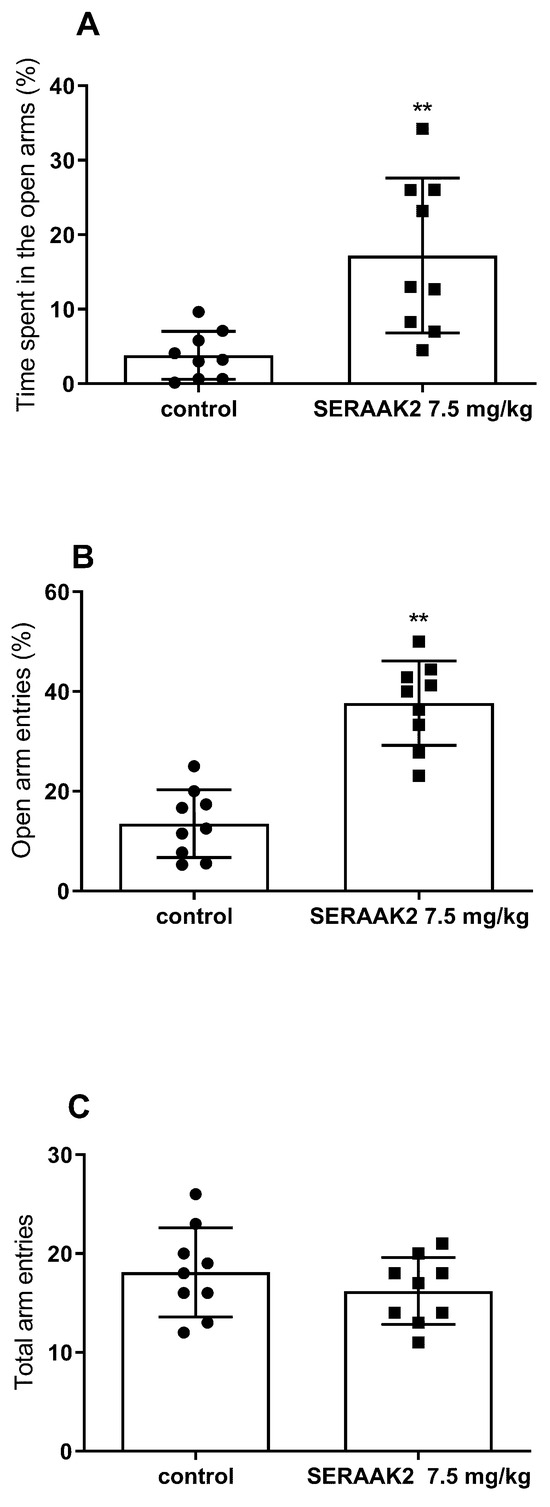 The effects of SERAAK2 (at a dose of 7.5 mg/kg, i.p.) on elevated plus maze performance in mice—percentage of time spent in open arms (A), percentage of the open arm entries (B), and total arm entries (C). The tested compound was injected 60 min prior to testing. Data are expressed as mean ± SEM from a single independent experiment. ** p < 0.01, vs. control (Student’s t-test).