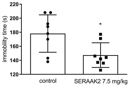 The effects of SERAAK2 (at a dose of 7.5 mg/kg, i.p.) on the immobility time in the forced swim test in mice. The tested compound was injected 60 min before testing. Data are expressed as mean ± SEM from a single independent experiment. * p < 0.05 vs. control (Student’s t-test).