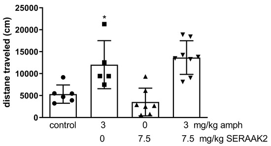 The effects of SERAAK2 (at a dose of 7.5 mg/kg, i.p.) on amphetamine-induced hyperactivity in mice. The compound was injected 60 min prior to testing, followed by amphetamine (3 mg/kg) 30 min later. Data are expressed as mean ± SEM from a single independent experiment. * p < 0.05 vs. control (Dunnett’s test).