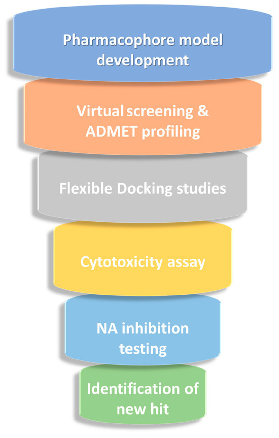 Extensive efforts have been made to overcome the poor pharmacokinetic and resistance issues associated with competitive NA inhibitors as SA-analogs through structural modifications designed to enhance lipophilicity, selectivity, and binding to the catalytic pocket, including adjacent residues of the 150- and 430-loops (residues 430–439). However, the continuous emergence of resistant viral strains underscores the urgent need to expand the structural diversity of NAIs and explore new chemotypes beyond well-known scaffolds. Various researchers were engaged in development of new NAIs harnessing natural-inspired small molecules as well as heterocyclic-based compounds from synthetic sources [22,31,32,33]. In this framework, our study was conceived to identify innovative small-molecule candidates with a chemical core distinct from oseltamivir and related analogs, while preserving the ability to interact with the catalytic site of the pandemic H1N1 neuraminidase (09N1). To achieve this objective, we implemented a multi-step computational strategy summarized in Figure 2, integrating computational modeling, virtual screening, and preliminary biological validation.