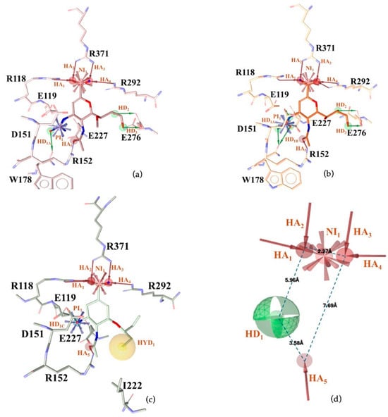 Using LigandScout v4.5 [41] we created the corresponding three structure-based pharmacophore models depicted in Figure 3a–c for N1 bound to laninamivir (pink), zanamivir (orange), and oseltamivir (pale green) within the cavity devoted to substrate SA.