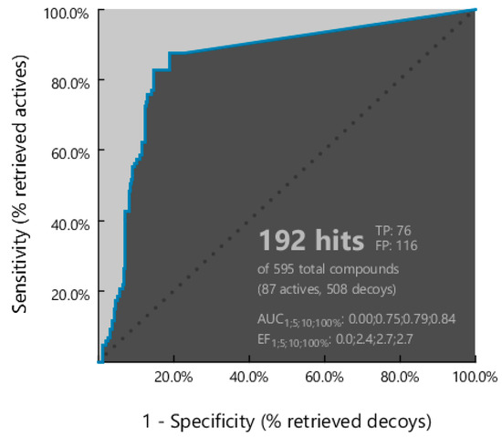 Additionally, pharmacophore performance was assessed using standard metrics implemented in LigandScout [41], including the receiver operating characteristic (ROC) curve, area under the ROC curve (AUC), and enrichment factor (EF) (Figure 4). The model correctly identified all 87 active compounds (true positives) and misclassified 116 inactive compounds as active compounds (false positives). The resulting AUC of 0.84 reflects excellent discrimination between active and inactive molecules. Furthermore, the enrichment factor (EF) of 2.7, calculated over the full dataset, indicated a moderate enrichment capacity, confirming that the pharmacophore model significantly outperformed random selection. Taken together, the strong AUC and reasonable EF values supported the robustness and predictive utility of the model.