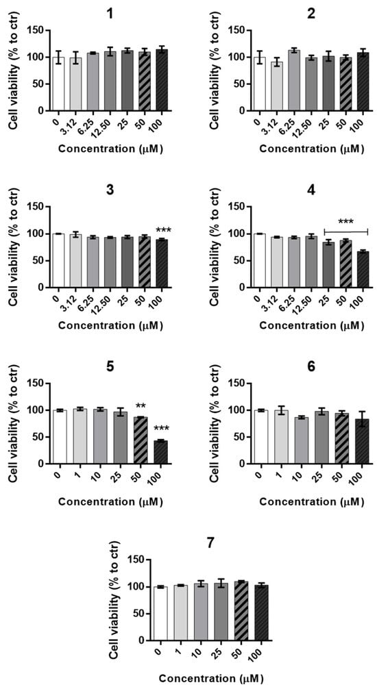 Cell viability assessed by metabolic activity (MTS assay) in HEp-2 epithelial cells treated for 24 h with the potential NA-targeting inhibitors. Each subfigure label corresponds to one of the seven tested compounds 1–7 at the indicated concentrations. Data are expressed as mean ± SD (n = 3 independent experiments performed in duplicate) and are presented as percentages relative to untreated control cells (0 µM), which were assigned a value of 100% cell viability. Statistical analysis was performed using one-way ANOVA followed by Bonferroni’s multiple-comparison test (** p < 0.01, *** p < 0.001 vs. control).