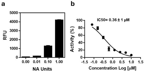 (a) Titration of recombinant H1N1 neuraminidase tested in the range of 0.01–1.0 U. (b) Dose–response inhibition curve of recombinant H1N1 neuraminidase treated with increasing concentrations of oseltamivir (0.08–10 µM). Data are mean ± SD from three independent experiments performed in duplicate.