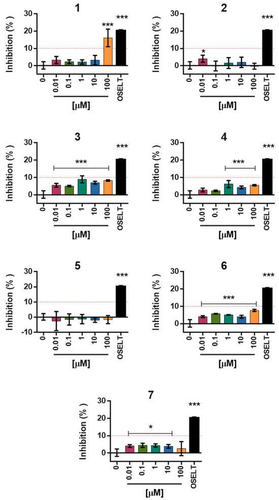 Fluorometric evaluation of neuraminidase inhibition by the selected compounds 1–7 tested at concentrations ranging from 0.01 to 100 µM. The numbers 1–7 identified the respective tested compounds. Oseltamivir at 0.1 µM was included as an internal reference inhibitor (black bars). Fluorescence data were processed to determine the inhibition percentage relative to the uninhibited enzyme control (0% inhibition). Results are expressed as mean ± SD of three independent experiments performed in duplicate. Statistical significance was assessed by one-way ANOVA with Bonferroni’s post hoc test (* p < 0.05; *** p < 0.001 vs. 0 control).