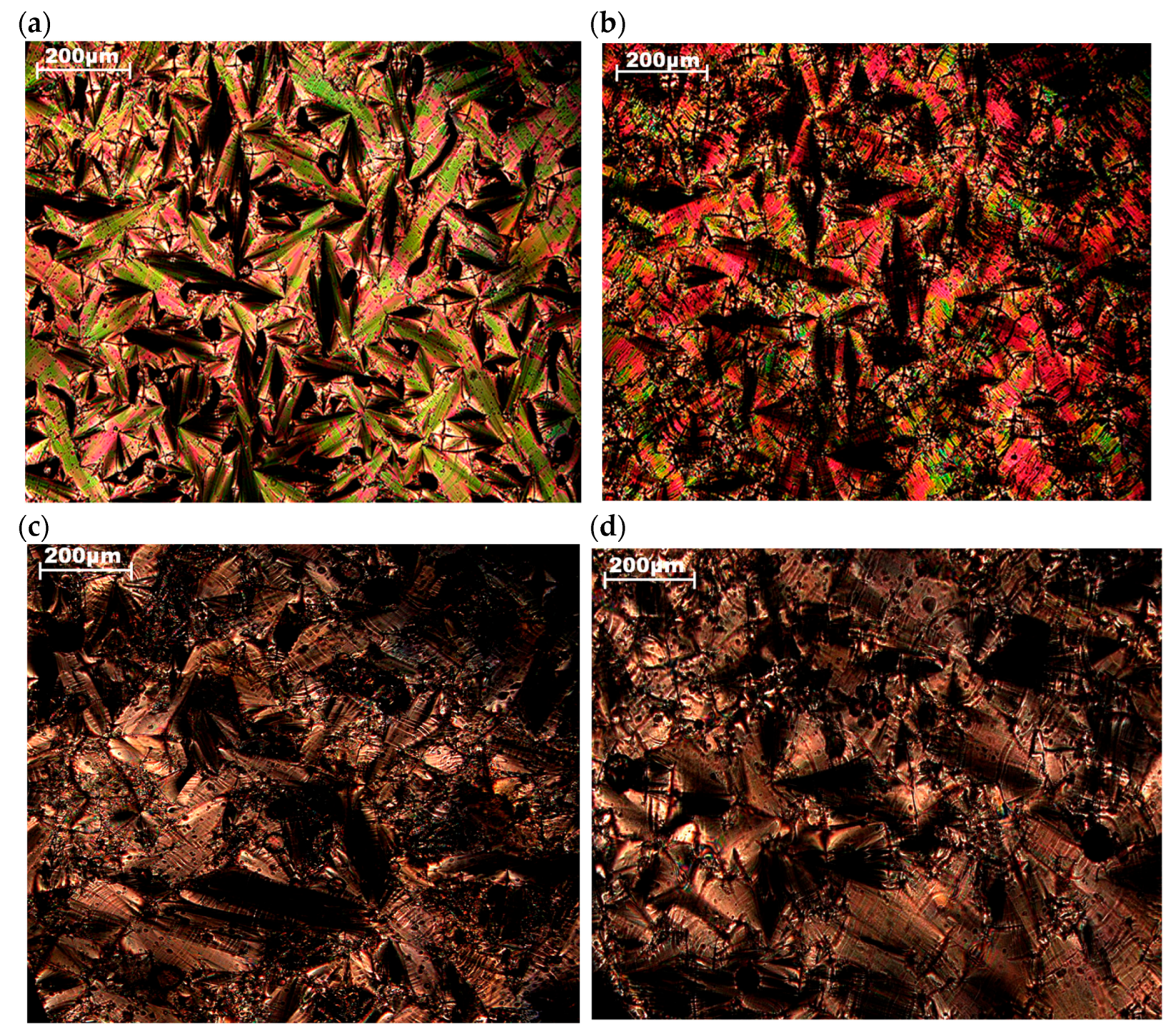 - Zaborin, E.A.; Borshchev, O.V.; Skorotetskii, M.S.; Gorodov, V.V.; Bakirov, A.V.; Polinskaya, M.S.; Chvalun, S.N.; Ponomarenko, S.A. Synthesis and Thermal and Phase Behavior of Polysiloxanes with Grafted Dialkyl-Substituted [1]Benzothieno[3,2-b][1]benzothiophene Groups. Polym. Sci. Ser. B 2022, 64, 841–854. [Google Scholar] [CrossRef]