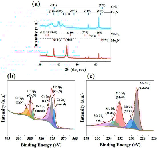 XRD and XPS spectra of the two coatings: (a) XRD patterns (Red indicates a MoN coating, while fluorescent colors denote a CrN coating), (b) XPS spectrum of Cr in the Cr/CrN coating, and (c) XPS spectrum of Mo in the Mo/MoN coating.