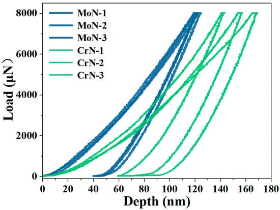 Nanoindentation curves of the CrN and MoN coatings.