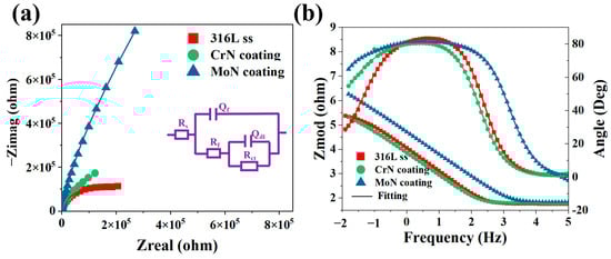 Figure 5 presents the electrochemical impedance spectroscopy (EIS) results of the metallic substrate and two coatings, with parameters fitted via the equivalent circuit models listed in Table 2. The data analysis indicated that after coating deposition, the corrosion resistance of the material improved by at least one order of magnitude compared with that of the substrate. Among them, the charge transfer resistance (Rct = 3.22 × 106 Ω·cm2) of the Mo/MoN coating was approximately 3 times greater than that of the Cr/CrN coating, and a higher Rct value directly corresponds to a stronger corrosion protection capability. A comprehensive analysis of the potentiodynamic polarization and EIS results revealed that the Mo/MoN multilayer coating possessed optimal corrosion resistance; this is attributed to the dense oxide layer formed at the interlayer effectively inhibiting the penetration of corrosive media, thereby significantly enhancing the protective performance of the coating. The phase angle at middle frequencies (around 104 Hz) can reflect the integrity of the coating layer [41]. The Mo/MoN coating showed a higher phase angle at this frequency range compared to the Cr/CrN coating, indicating a more intact and uniform coating structure. This structural integrity is crucial for preventing the ingress of corrosive substances and thus enhancing the overall corrosion protection. Moreover, the equivalent circuit model fitting results in Table 2 revealed that the Mo/MoN coating had a lower double-layer capacitance (Cdl) value compared to the Cr/CrN coating. A lower Cdl value typically implies a thicker and more compact passive film on the coating surface [42,43], which can effectively block the transfer of charge and ions between the coating and the corrosive environment, thereby improving the corrosion resistance. Overall, the comprehensive electrochemical analysis, including potentiodynamic polarization, EIS, and related parameter evaluations, clearly demonstrates that the Mo/MoN multilayer coating exhibits significantly better corrosion resistance than the Cr/CrN coating and the bare 316 L stainless steel substrate.