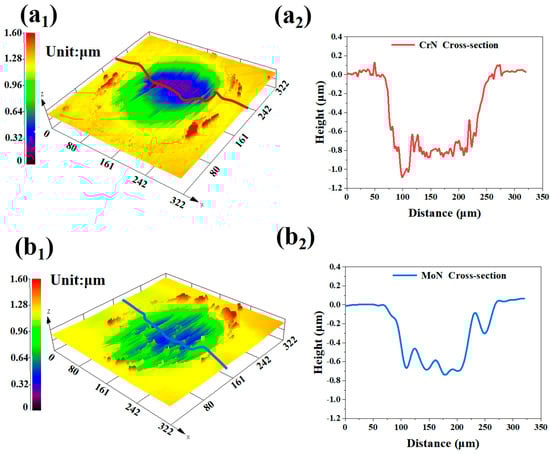 Three-dimensional morphological information of the wear tracks after 1 h of wear: (a1,a2) CrN coating and (b1,b2) MoN coating.