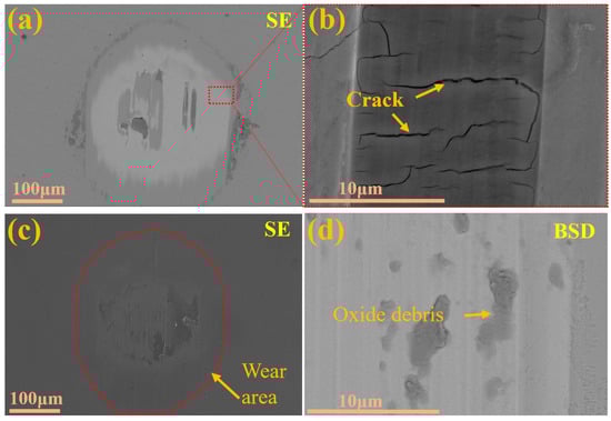 Morphology of the wear scar of the coating after 1 h of wear: (a,b) Cr/CrN, (c,d) Mo/MoN.
