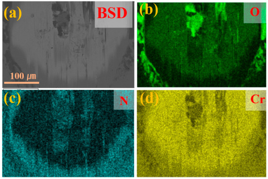 Elemental distribution within the wear track of the Cr/CrN coating: (a) Electron micrograph, (b–d) Distribution maps of O, N, and Cr elements.