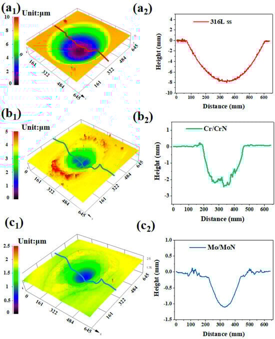 Three-dimensional topographies of the worn surfaces after fretting corrosion: (a1,a2) 316 L stainless steel, (b1,b2) Cr/CrN coating, (c1,c2) Mo/MoN coating.