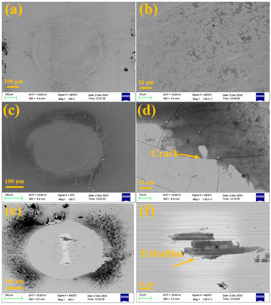 Figure 12 displays the microscopic morphologies of the wear scars on the substrate and coating samples after fretting corrosion. As seen in Figure 12a,b, the wear scar of 316 L stainless steel is relatively smooth and contains a small amount of residual protein, which provides a certain lubricating effect.