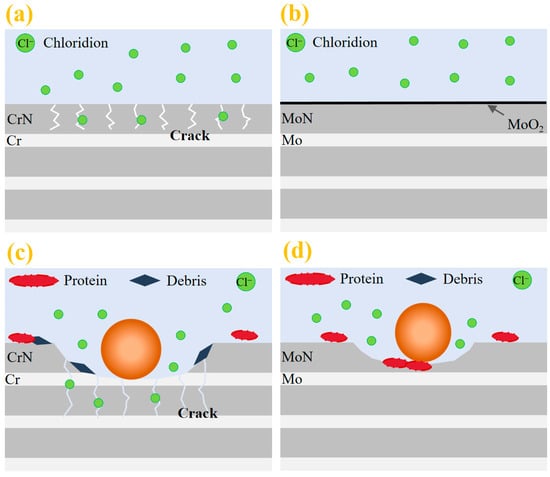 Corrosion and fretting corrosion behavior: (a) corrosion process of Cr/CrN coating and (b) Mo/MoN coating; (c) fretting corrosion of the Cr/CrN coating and (d) Mo/MoN coating.