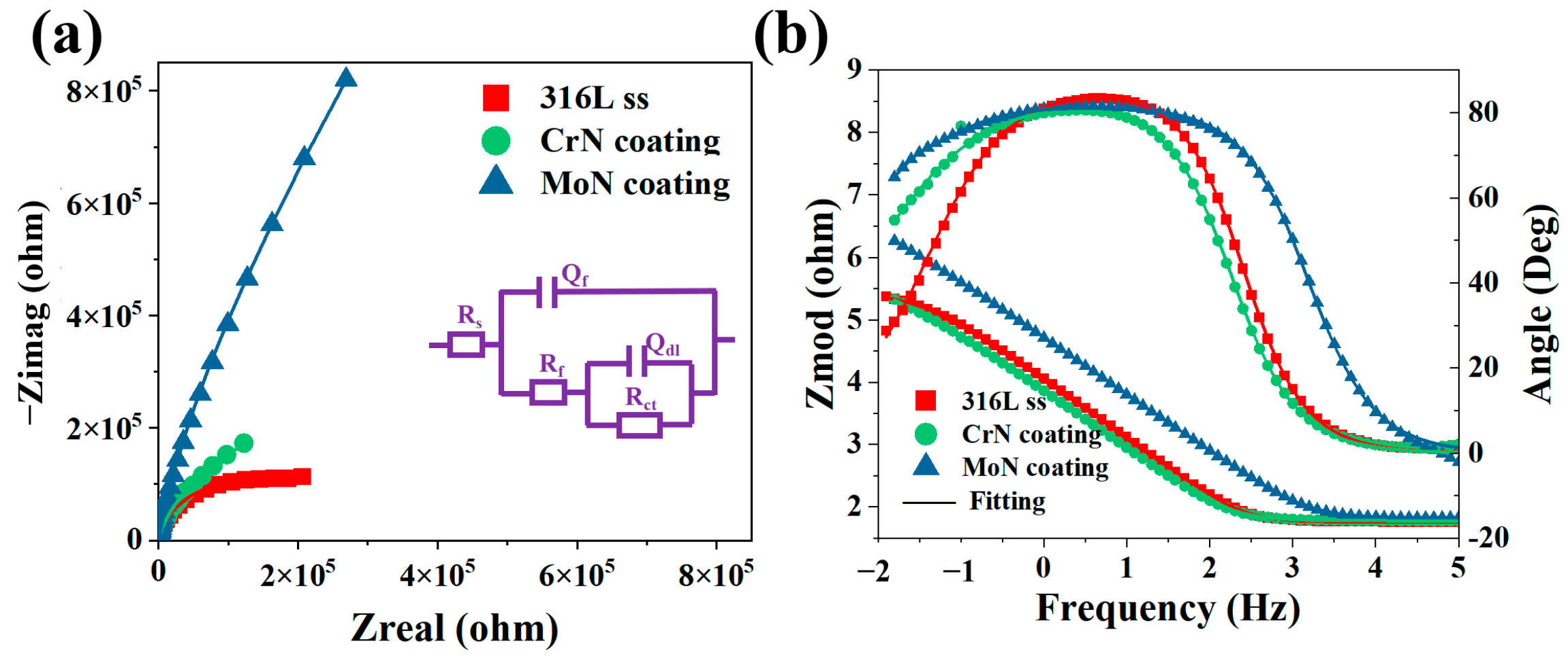 - The Mo/MoN coatings demonstrated significantly better corrosion resistance than the Cr/CrN coatings, which can be attributed to two main factors: the barrier effect of the MoO2 oxide layer against the penetration of corrosive species, and the inherently denser microstructure of the Mo-based coating. Accordingly, the corrosion resistance ranking was established as: Mo/MoN > Cr/CrN > 316 L substrate.