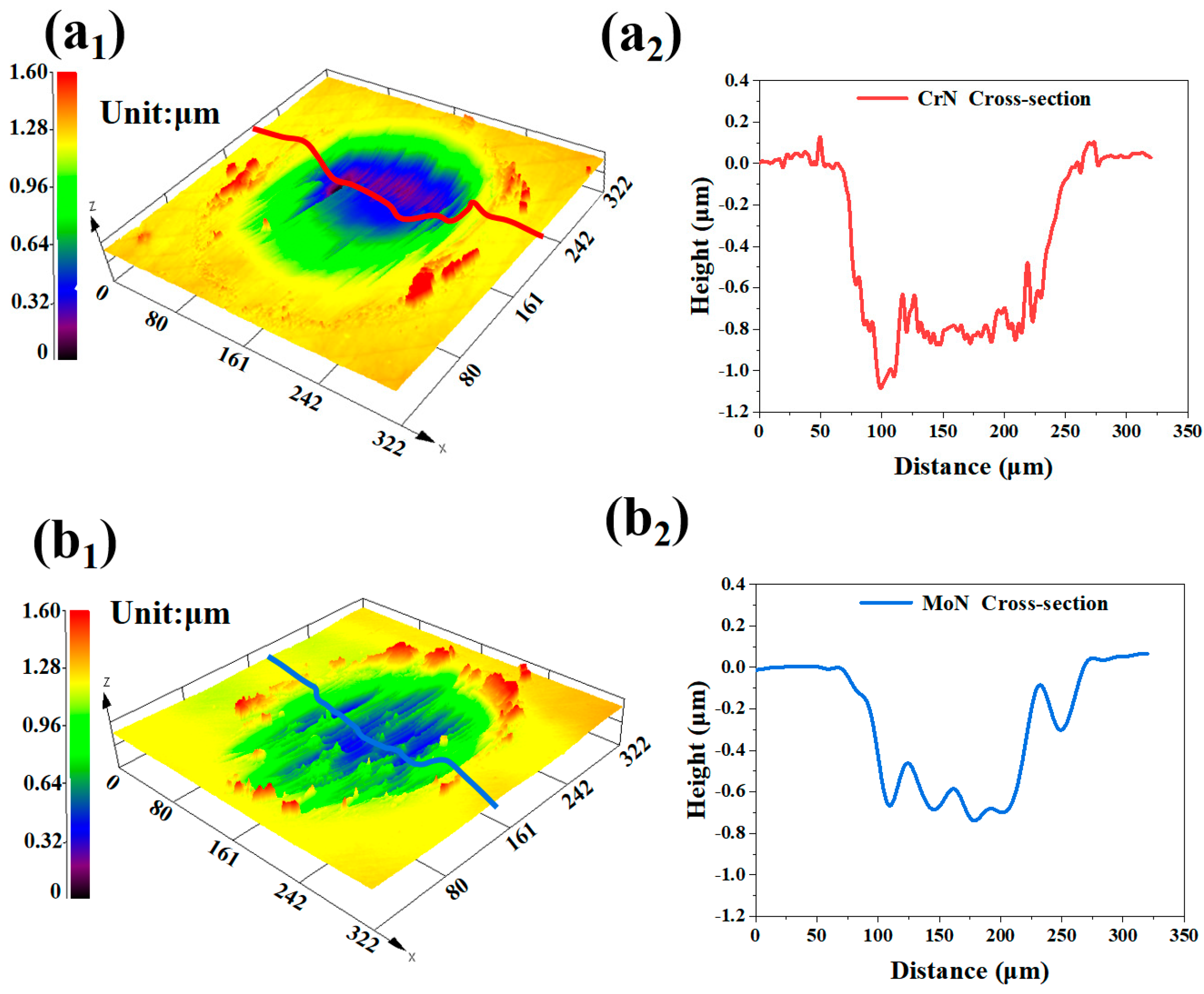 - Owing to their higher hardness and excellent deformation resistance, the molybdenum-based nitride coatings exhibited better wear resistance than the chromium-based nitride coatings. During fretting corrosion tests, no cracking was observed in the Mo/MoN coatings, indicating their high resistance to deformation-induced cracking. Furthermore, the combination of superior corrosion resistance and greater mechanical strength resulted in better overall fretting corrosion performance of the Mo/MoN coatings compared to the Cr/CrN system.