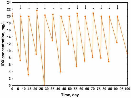 Changes in IOX concentration in AS during a 100-day experiment. IOX, iohexol; AS, activated sludge. Arrows indicate the introduction of the next doses of IOX. LOD/LOQ = 3.03.