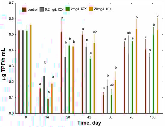 Changes in the TPF concentration (µg/mL·h) in the AS exposed to different concentrations of IOX for 100 days. Means with different letters in each sampling day are significantly different (p < 0.05, LSD test) considering the effect of IOX concentration. Means without letters did not differ from others on the corresponding sampling day. TPF, triphenyl formazan; IOX, iohexol; AS, activated sludge; LSD, least significant difference.