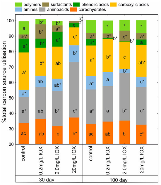 Changes in the utilisation of distinguished groups of carbon sources in control AS and AS treated with IOX (0.2, 2.0, or 20 mg/L) on day 30 and day 100. Means of each carbon source group labelled with different letters are significantly different (p < 0.05, LSD test), considering the effect of IOX concentration on each sampling day. Pairs of means with the same IOX concentration marked with an asterisk are significantly different (p < 0.05, the independent samples t-test), considering the effect of time (day 30 vs. day 100).