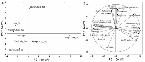 Analysis of the metabolic profile of AS in the presence of IOX indicated that a low concentration of 0.2 mg/L did not significantly alter metabolic activity. However, a concentration of 20 mg/L induced significant changes in the metabolic profile of AS (Figure 4).
