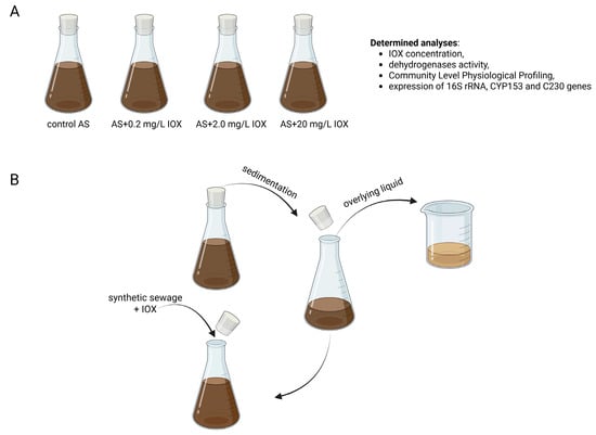 The AS was collected from the aeration tank of the wastewater treatment plant Klimzowiec (Katowice, Poland). First, AS was transferred to the 1-L laboratory-scale AS systems in triplicate. Subsequently, AS was contaminated with IOX at concentrations of 0.2, 2.0, and 20 mg/L. AS without IOX addition was treated as the control (Figure 6A). The ‘start’ sample corresponded to the untreated sewage (control AS) at the beginning of the experiment. All sets were maintained at a stable temperature (21 °C) and aerated under shaking conditions (130 rpm) for 100 days. At 7-day intervals, AS was sedimented for 30 min, the overlying liquid was removed, and AS was supplemented with fresh synthetic sewage (composition according to [32] and the appropriate amount of IOX to achieve the intended initial concentrations (Figure 6B).