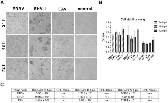 The CPE caused by EAV increased steadily over time, reaching a maximum at 72 h p.i. The titers of the viruses were the highest at 48 h p.i. for EHV-1 and ERBV, while for EAV, the highest titer was reached at 72 h p.i. (Figure 1C).