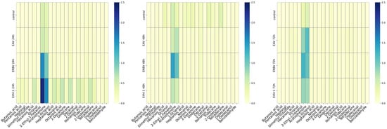 Heatmaps of mean concentrations of volatile organic compounds (VOCs) in infected cultures at different timepoints after infection (p.i., post-infection): 24 h p.i. (left panel); 48 h p.i. (middle panel); 72 h p.i. (right panel). Control—uninfected cells; EHV-1—equine herpesvirus 1; EAV:—equine arteritis virus; ERBV—equine rhinitis B virus. Scales in μg per g.