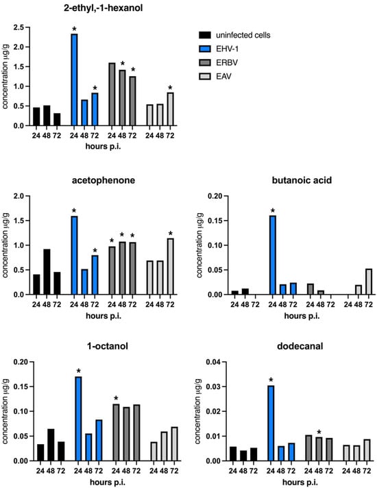 Mean concentrations of individual VOCs (μg per g) across experimental timepoints. A star (*) denotes a statistically important increase in the concentration of a particular VOC in virus-infected samples in comparison to the concentration in uninfected control samples at an indicated timepoint; p < 0.05 (one-way ANOVA). p.i.—post-infection; EHV-1—equine herpesvirus 1; ERBV—equine rhinitis virus B; EAV—equine arteritis virus. Graphs were generated with GraphPad Prims.