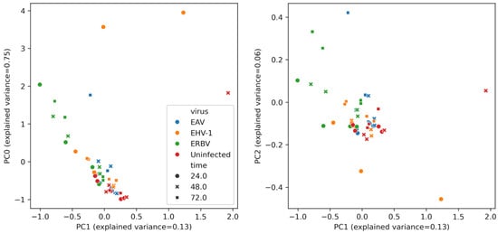 A multivariate analysis of the concentrations of the compounds (after removing background, i.e., concentrations of compounds in the medium) is presented in Figure 4. Uninfected samples are clustered on the left, whereas infected samples lay on the manifold below and to the left in the PC0-PC1 plot. We observe that the EHV-1 points (orange) tend to have high values along PC0, while the ERBV points are located to the left of the PC1 axis. The points of EAV, a virus that produced a less pronounced CPE, tend to be relatively low along the PC0 axis. The gradient structure of the data in the PC0-PC1 view indicates a strong statistical coupling between these principal component vectors.