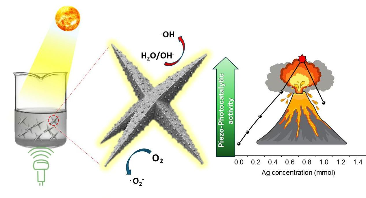 Under ultrasonic excitation, the ZnO microtetrapods undergo anisotropic mechanical deformation, which generates a localized piezoelectric field. These internal electric fields promote efficient separation of photogenerated charge carriers and direct the transport of electrons and holes toward different surface regions. Simultaneously, the plasmonic excitation of Ag nanoparticles produces hot electrons that are injected into the conduction band of ZnO, further enhancing the electron flow induced by mechanical deformation.