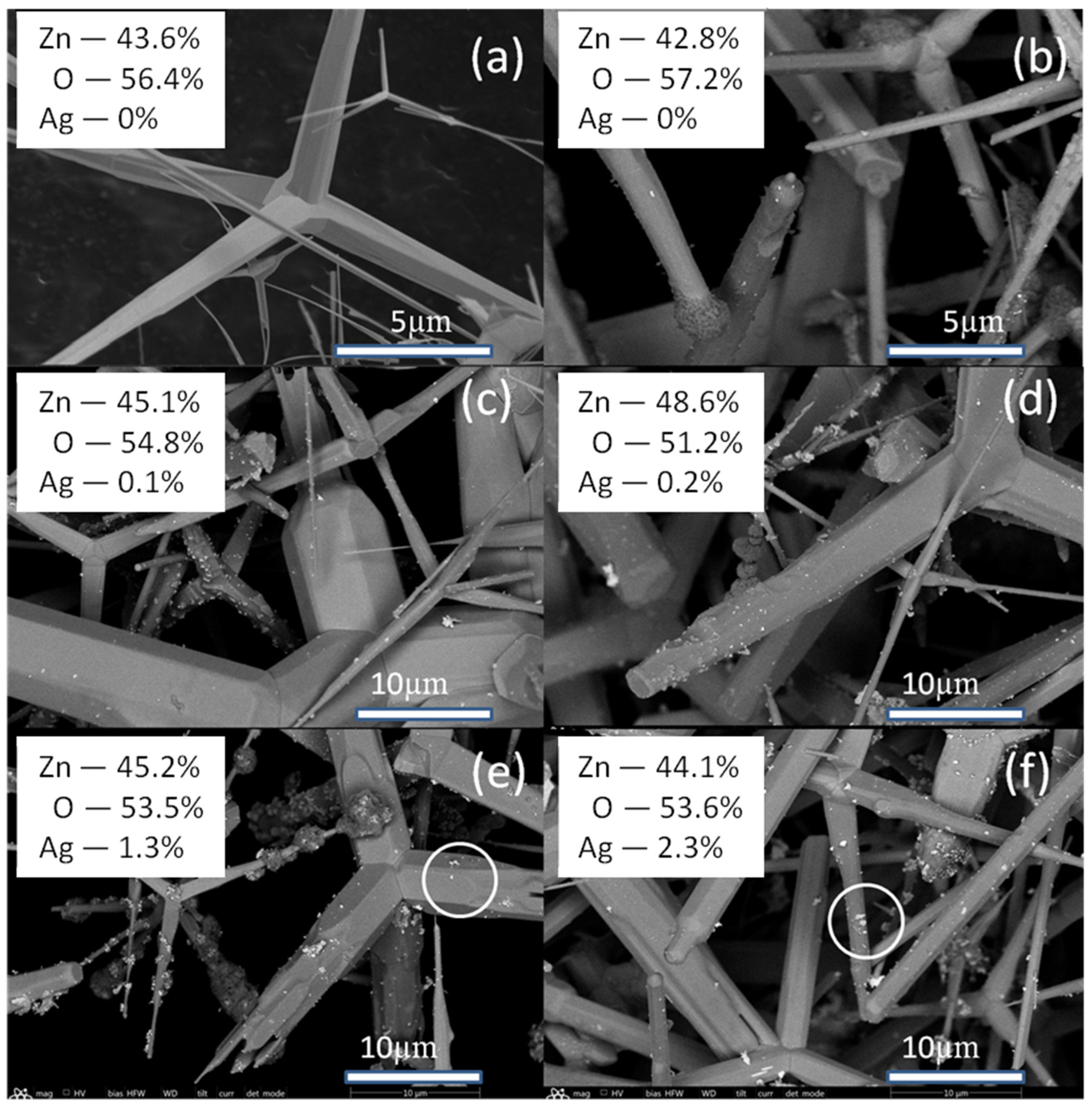 Figure 1. SEM images of ZnO/Ag microstructures: types 0 (a); 0.1 (b); 0.25 (c); 0.5 (d); 0.75 (e); 1 (f). Designation: white circles—clusters of Ag particles.