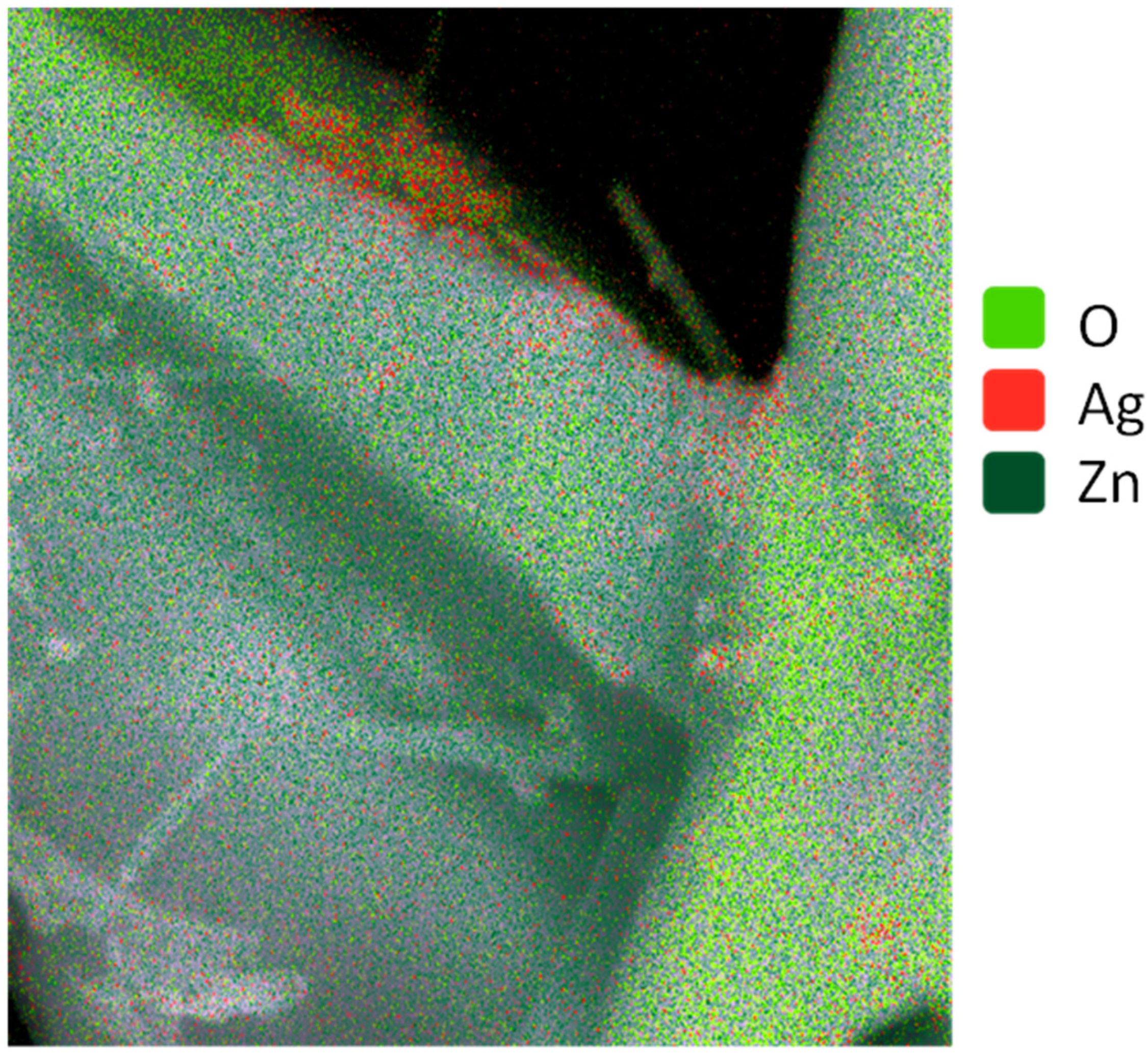 Figure 3. EDX mapping of of typical Ag nanoparticle clusters on ZnO tetrapods.