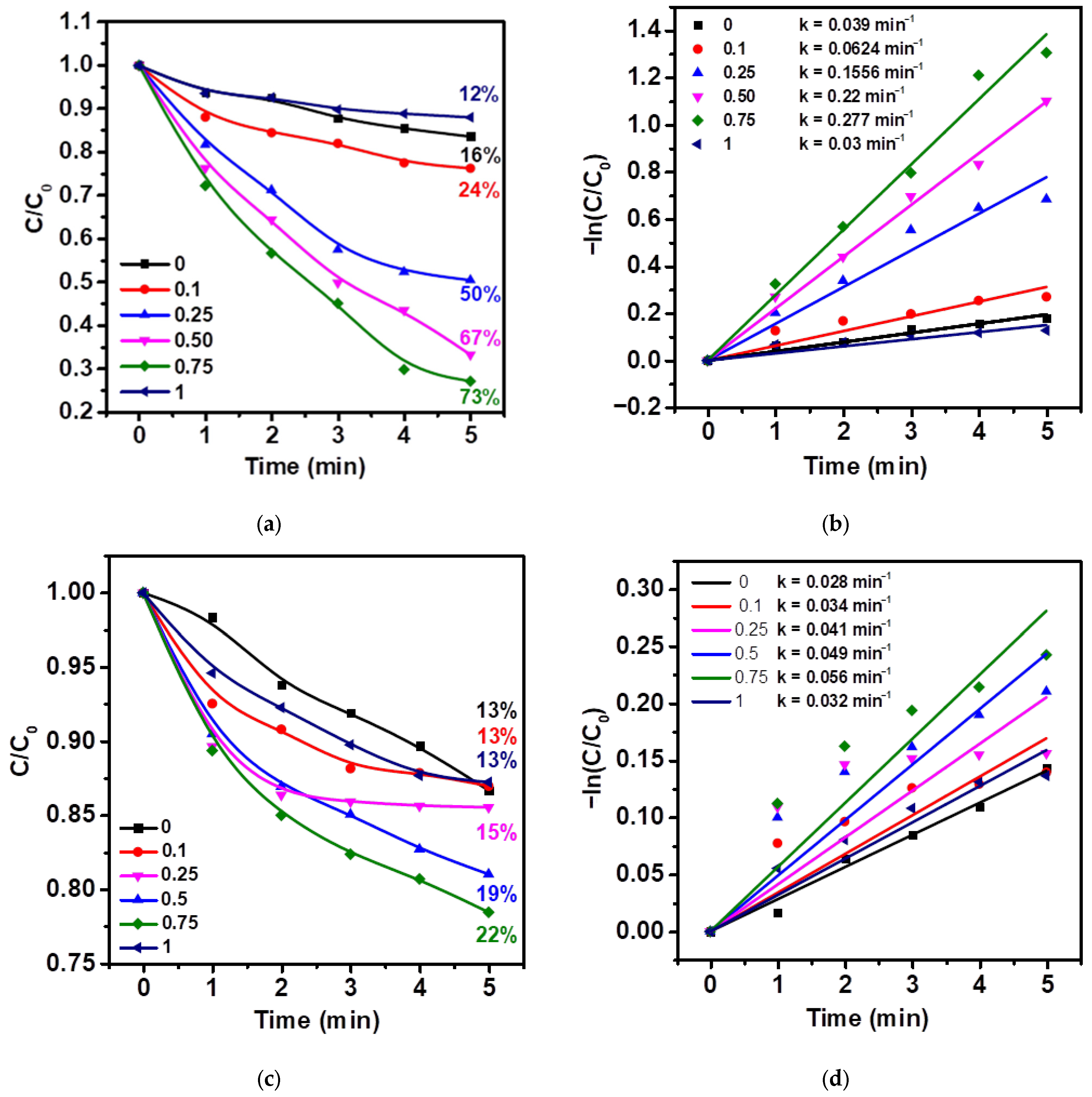 Figure 7. Results of photocatalytic (a,b) and piezocatalytic (c,d) degradation of MNZ using pristine ZnO tetrapods (type 0) and Ag-modified samples with various silver contents. (a) Temporal variation of the relative concentration C / C 0 under photocatalytic conditions; (b) kinetic analysis based on the pseudo-first-order model. (c) Temporal variation of C / C 0 under piezocatalytic conditions driven by ultrasound (40 kHz, 120 W) in the absence of light; (d) corresponding kinetic curves with rate constant calculations.