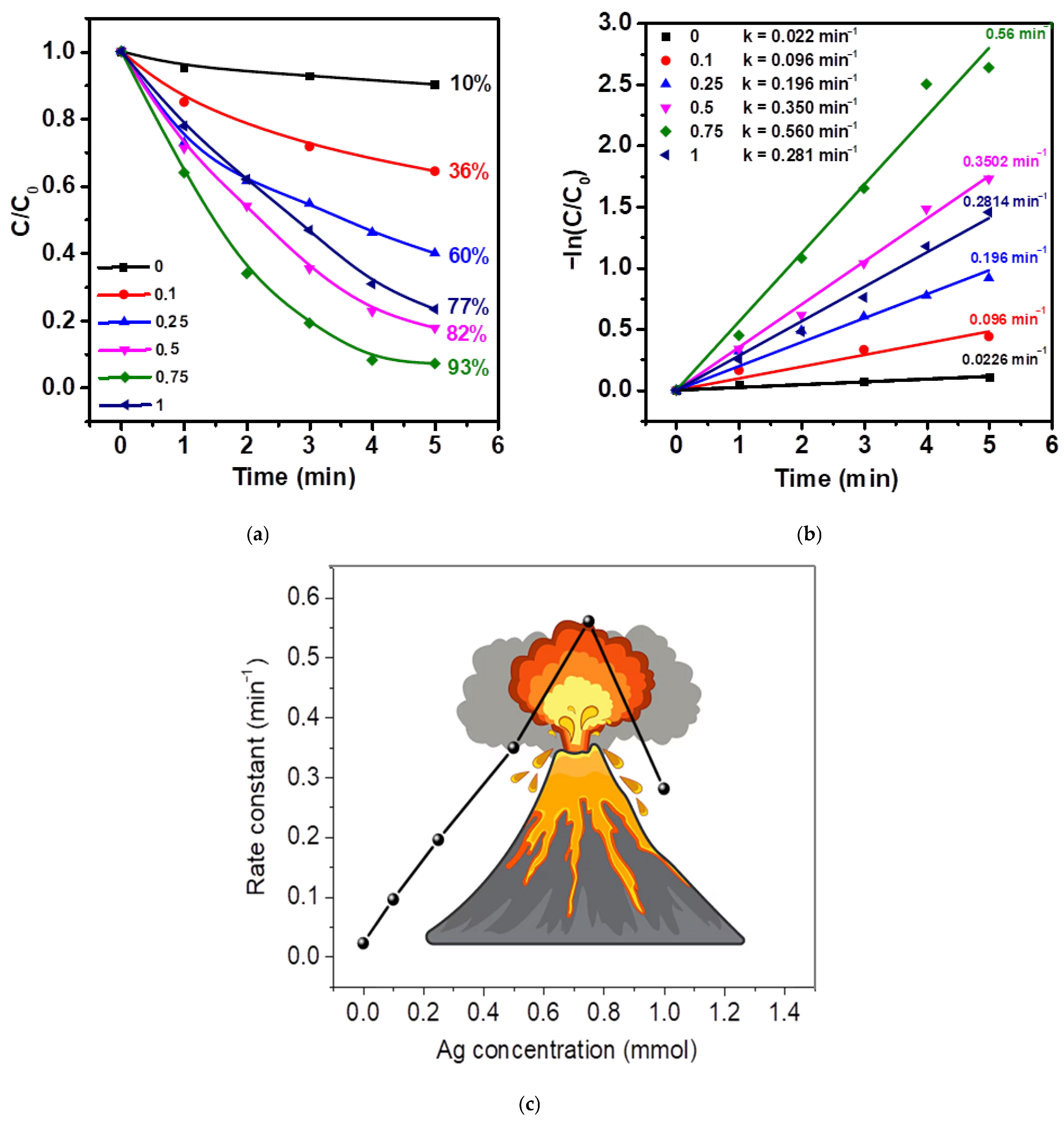 Figure 8. Piezo-photocatalytic degradation of metronidazole over ZnO microtetrapods decorated with different Ag loadings under metal-halide lamp irradiation and ultrasonication (40 kHz, 120 W): (a) degradation curves C/C0 vs. time; (b) pseudo-first-order kinetics; (c) volcano-type dependence of the rate constant on the initial Ag+ concentration in the precursor AgNO3 solution.