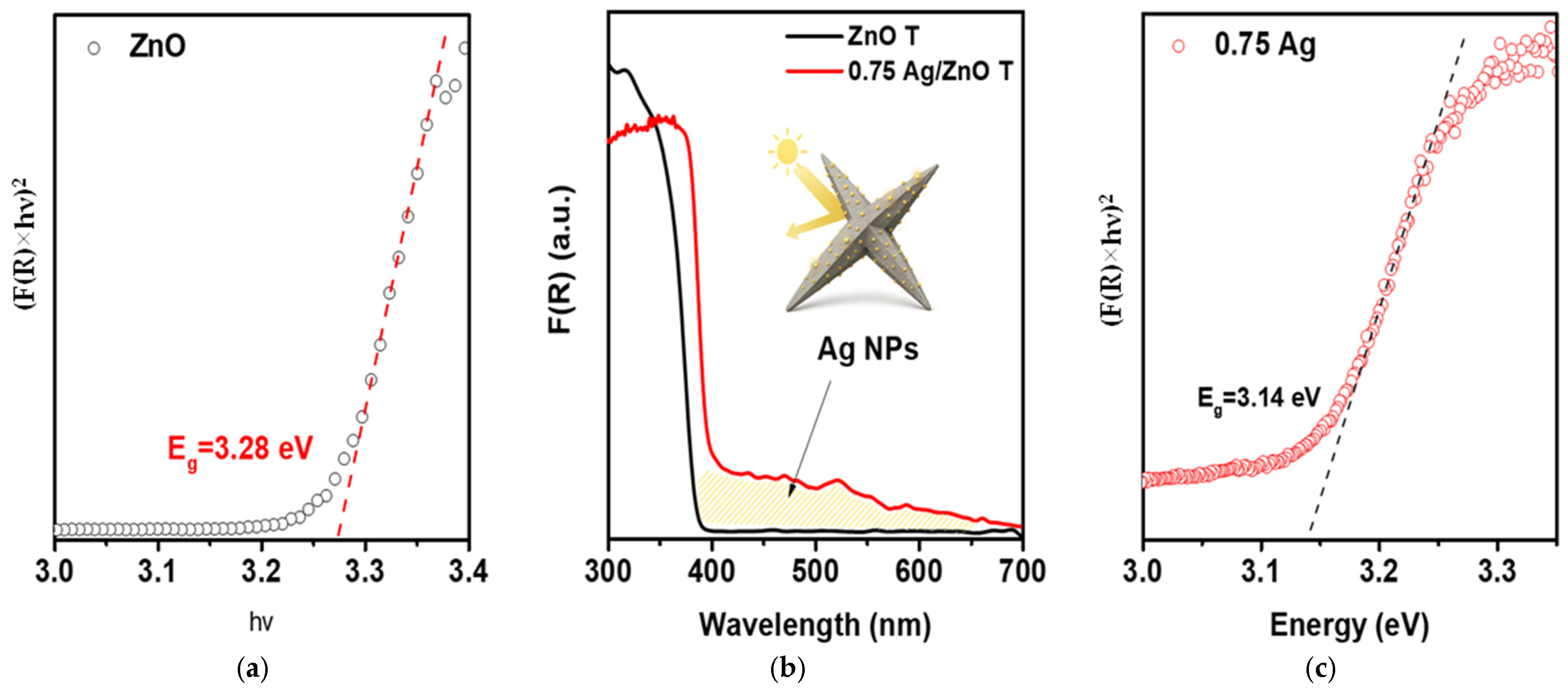It is worth noting that ZnO tetrapods are particularly promising catalysts, as they exhibit enhanced activity under visible-light irradiation [11]. When combined with other functional nanomaterials, ZnO tetrapods represent a valuable platform for a wide range of future applications. Owing to their ability to hyper-amplify signals in electronics and sensor devices, metal–semiconductor systems have found wide application. The amplification phenomenon arises from resonant light absorption at the metal–semiconductor boundary, leading to the excitation of localized plasmons [12,13,14]. Enhanced antibacterial and photocatalytic performance of ZnO/Au and ZnO/Ag nanocomposites has been demonstrated in Ref. [15]. Another important application of ZnO/Ag systems is the detection of ultra-low contamination levels by means of surface-enhanced Raman scattering (SERS) [16].