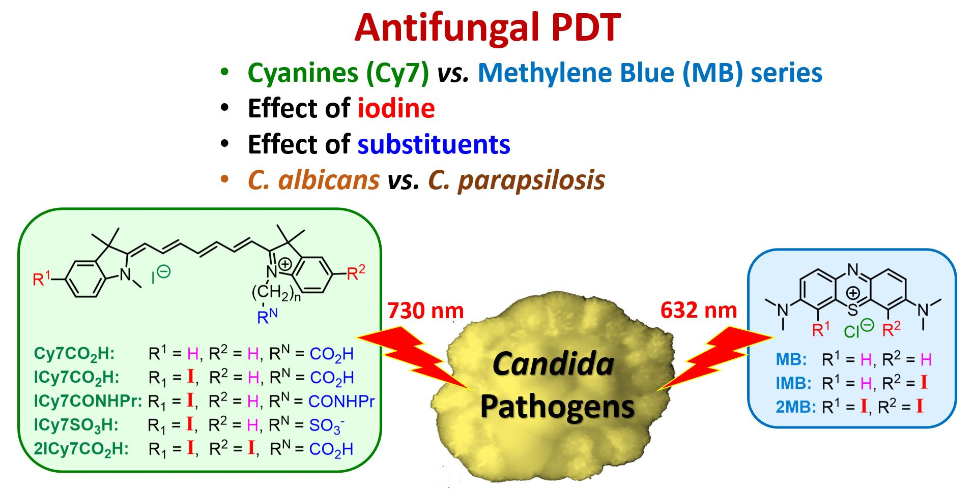 In the present study, for the first time, we developed a simple one-step synthetic approach and synthesized two iodinated MB derivatives—monoiodo (IMB) and diiodo-(2IMB) Methylene blue dyes. The photodynamic efficacy of these dyes and iodinated heptamethine cyanines was investigated against clinically relevant C. albicans and antifungal drug-resistant C. parapsilosis.