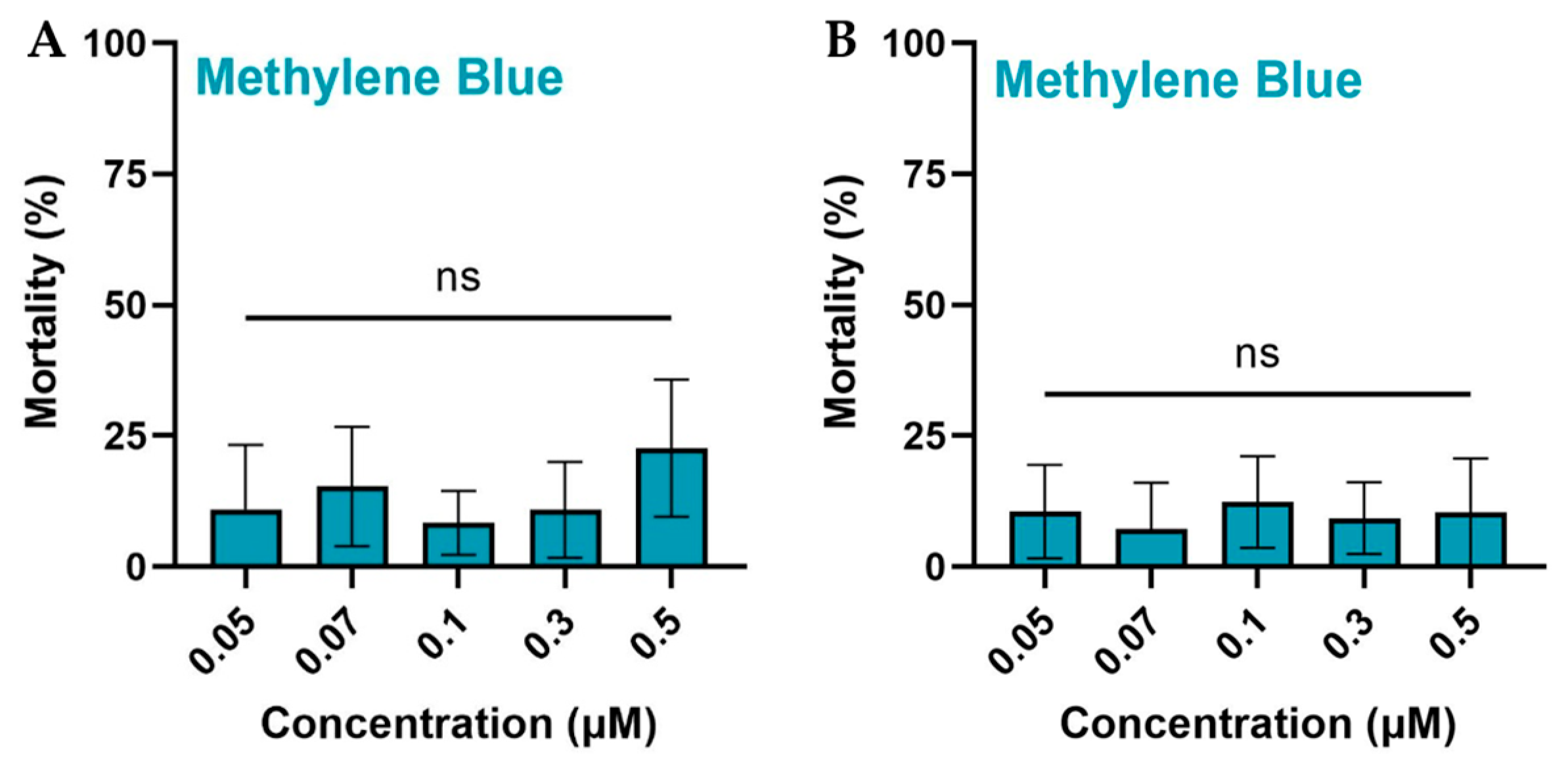 All preparatory procedures involving photosensitizers were performed in the dark to prevent premature activation and photobleaching. Stock solutions of cyanines and MB dyes were prepared in DMSO at concentrations of 0.05, 0.07, 0.1, 0.3, and 0.5 µM (confirmed spectrophotometrically). Subsequently, 10 µL of each dye solution was added to 1 mL of fungal suspension (103 cells/mL) in 0.9% saline in a Falcon® 48-well polystyrene clear flat-bottom plate at a final DMSO concentration of 1% for all the samples.