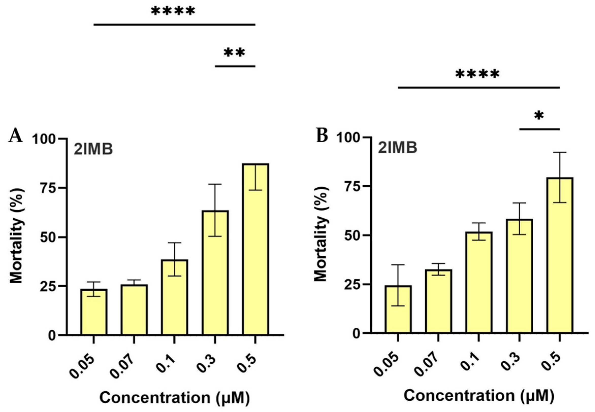 Fungal mortality was evaluated based on CFU counts and quantified by calculating the median lethal concentration (LC50) required to kill 50% of the cell population. Each experiment was performed in triplicate, and average values were reported.